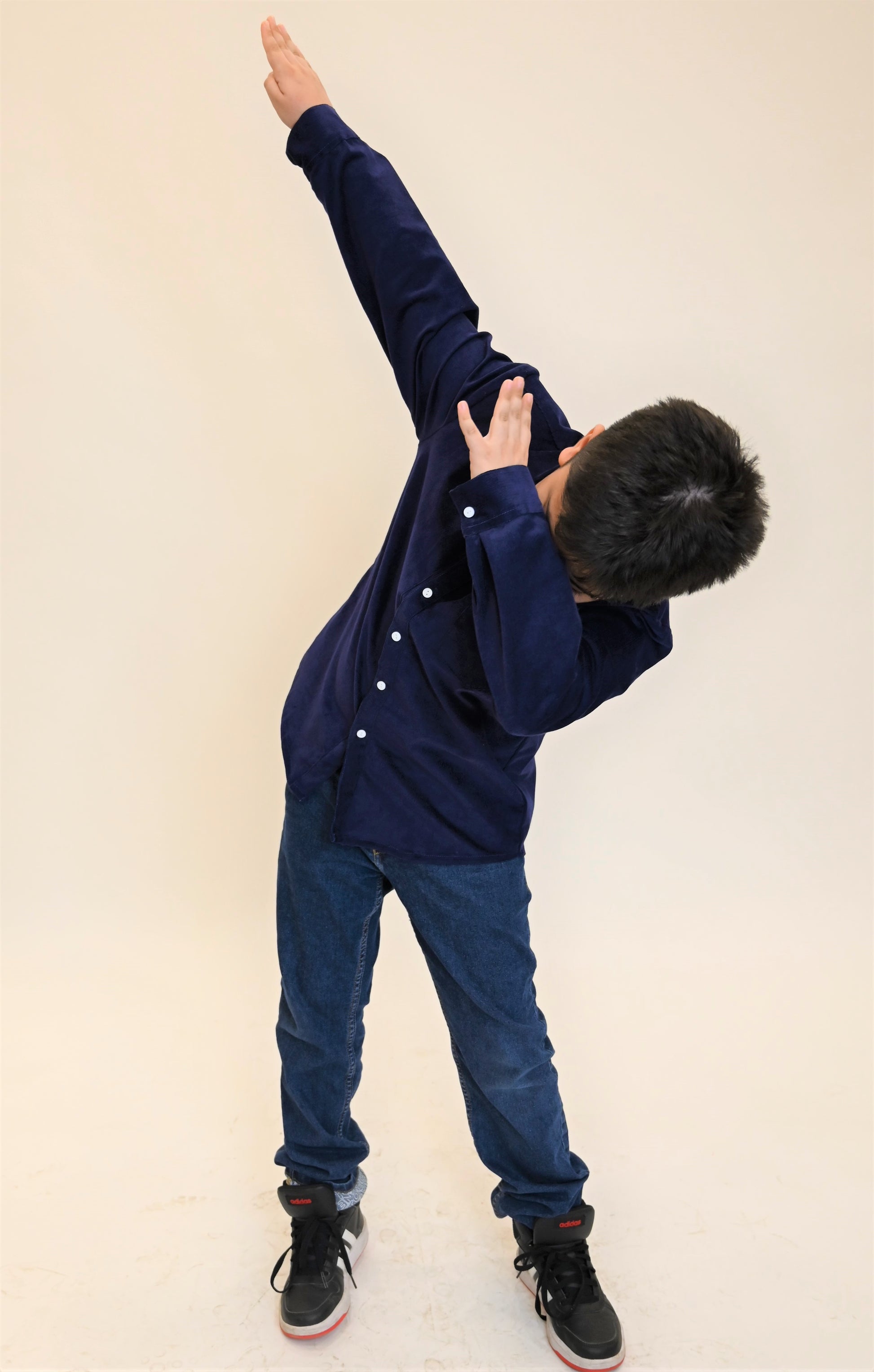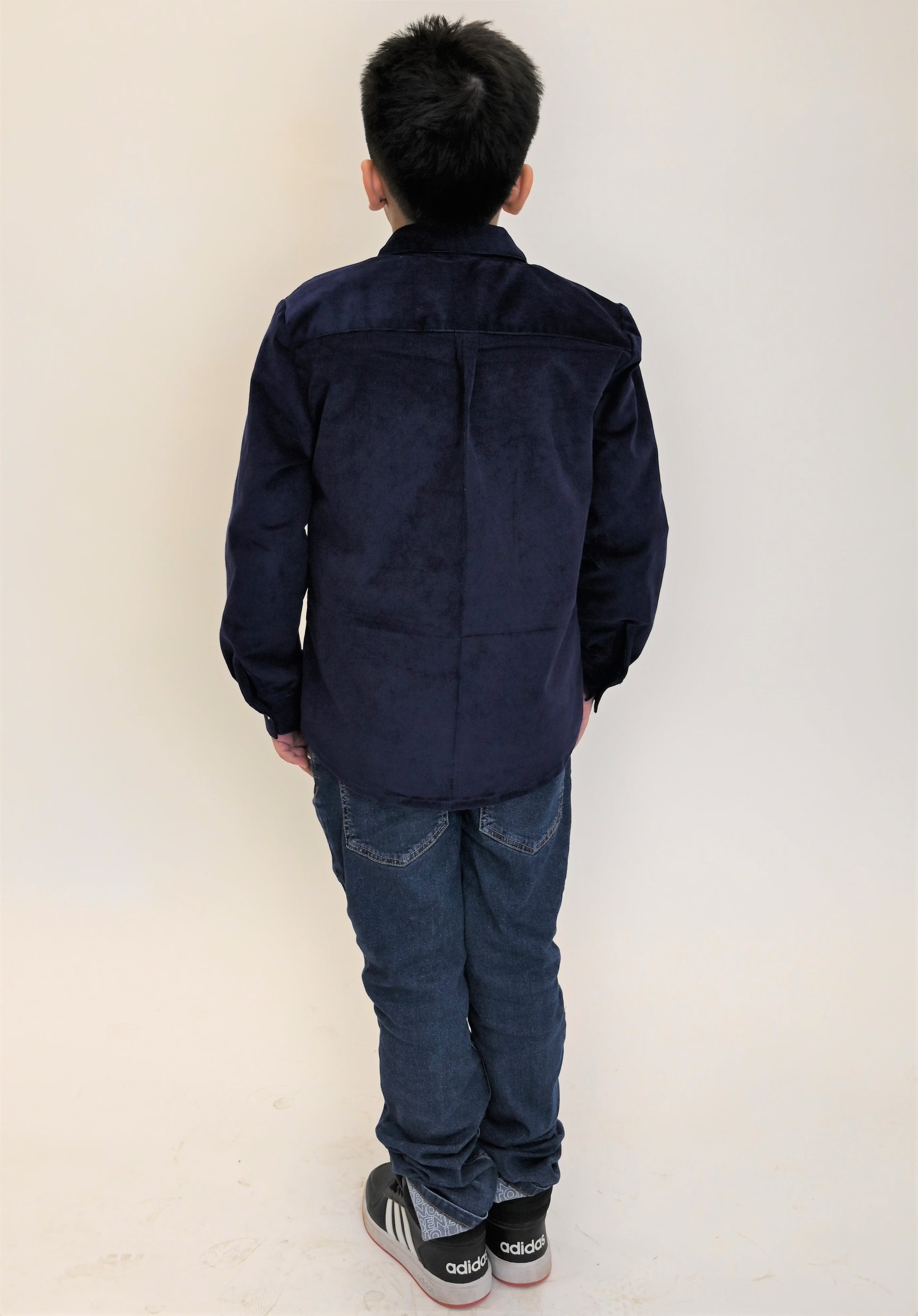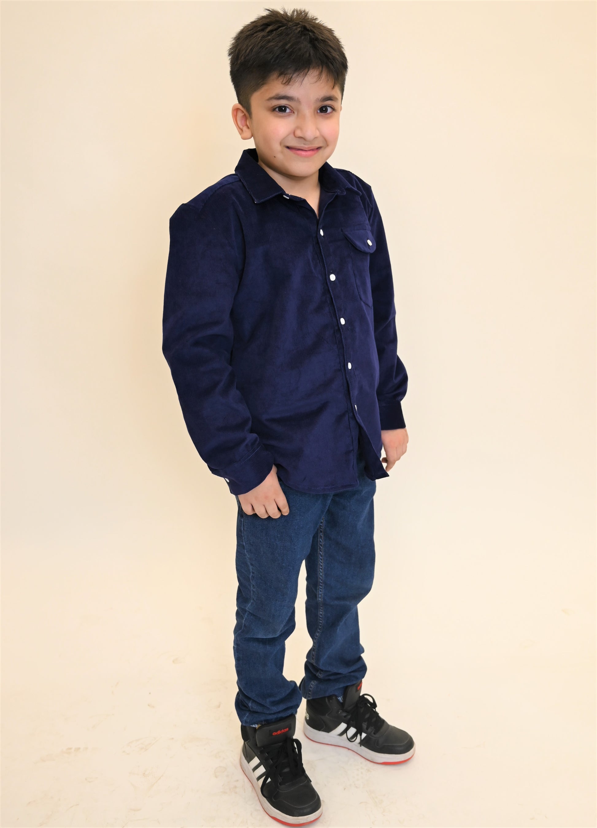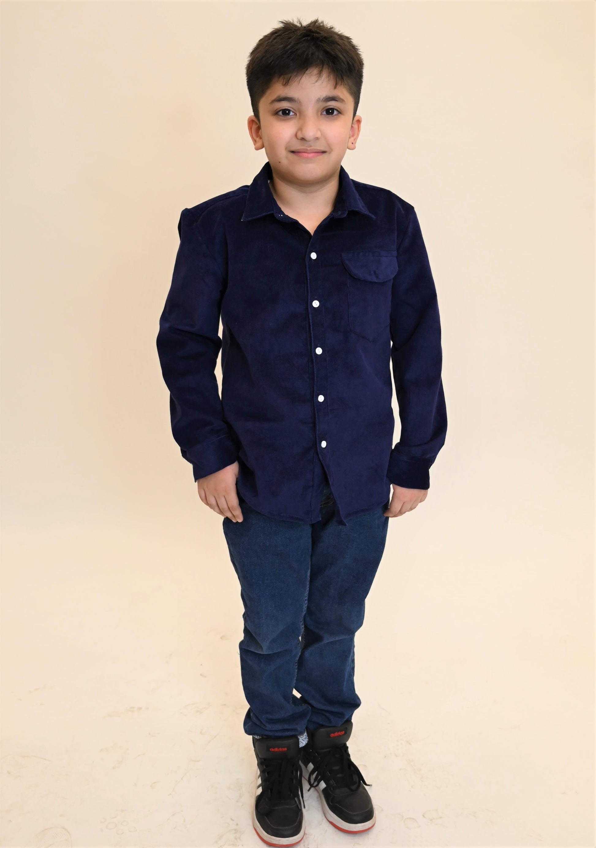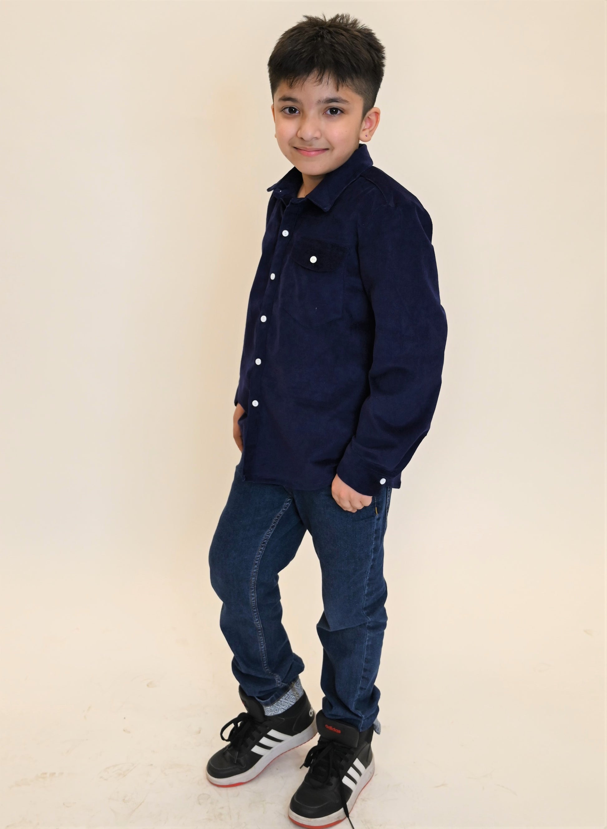 Boys Blue corduroy shirt has a button closure, patch pocket with full sleeves.