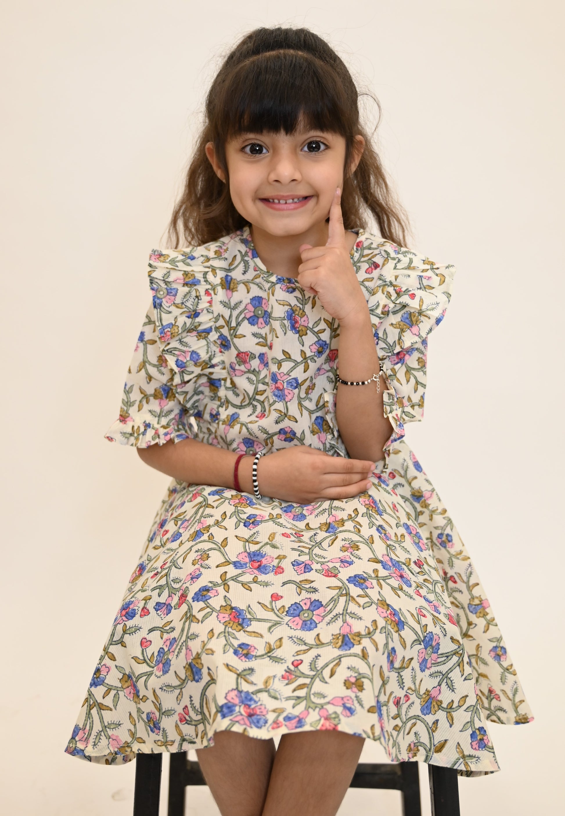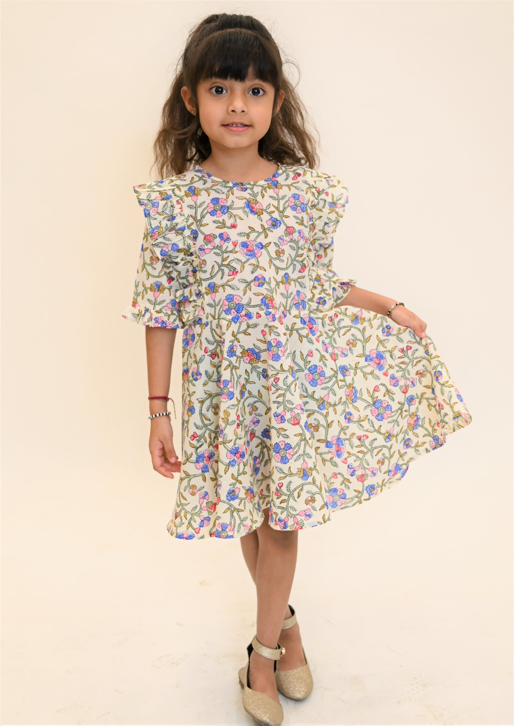 Product detail :- Girls floral print A-line dress has a round neck, frill detailing and flared hem.