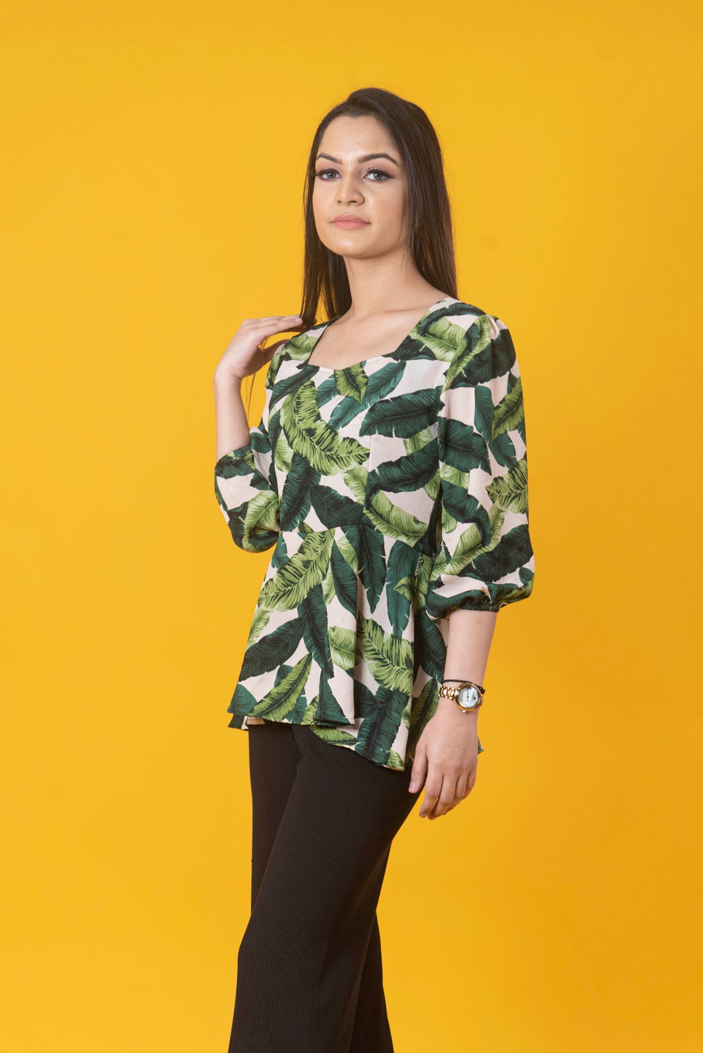 Printed Green peplum top, has a