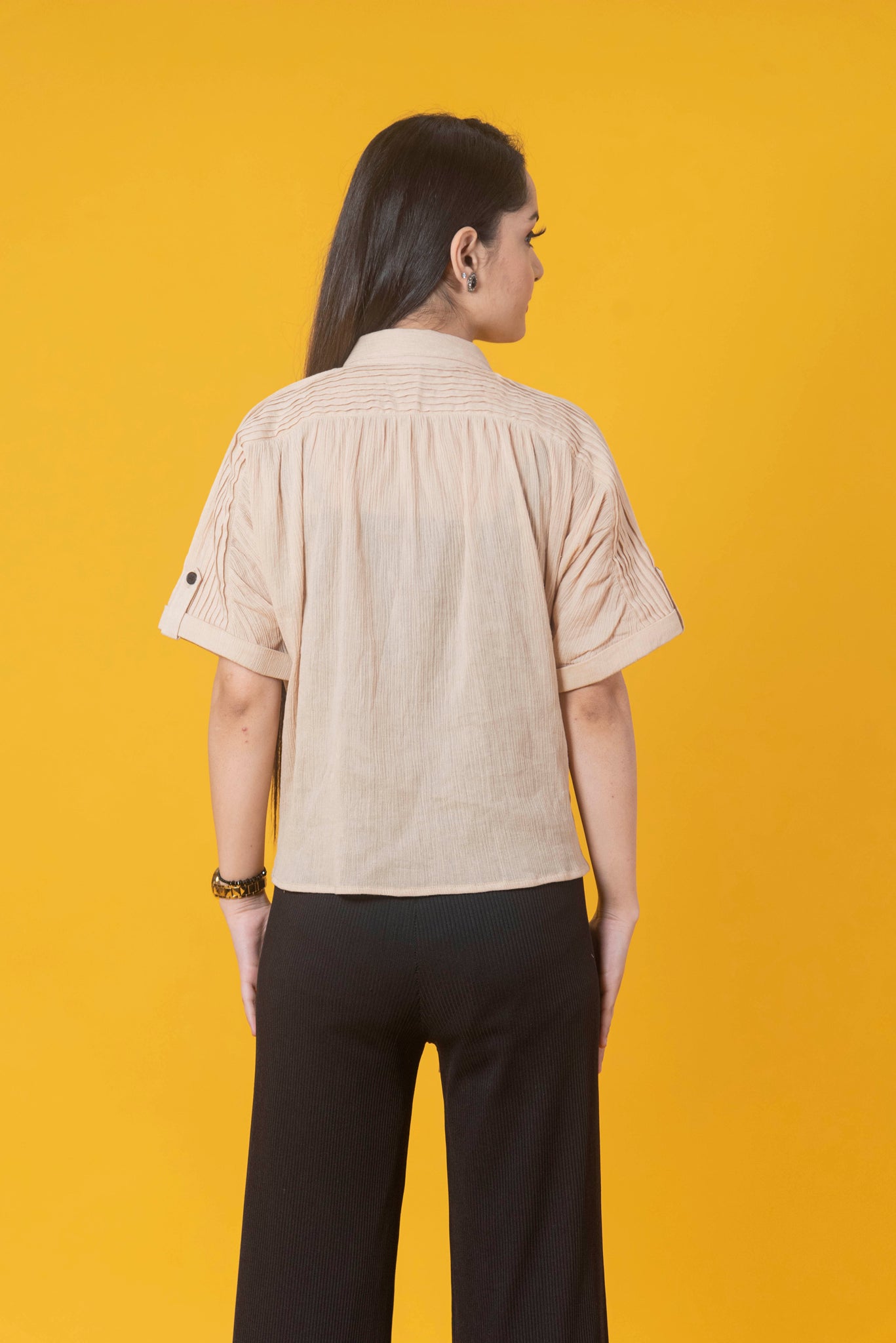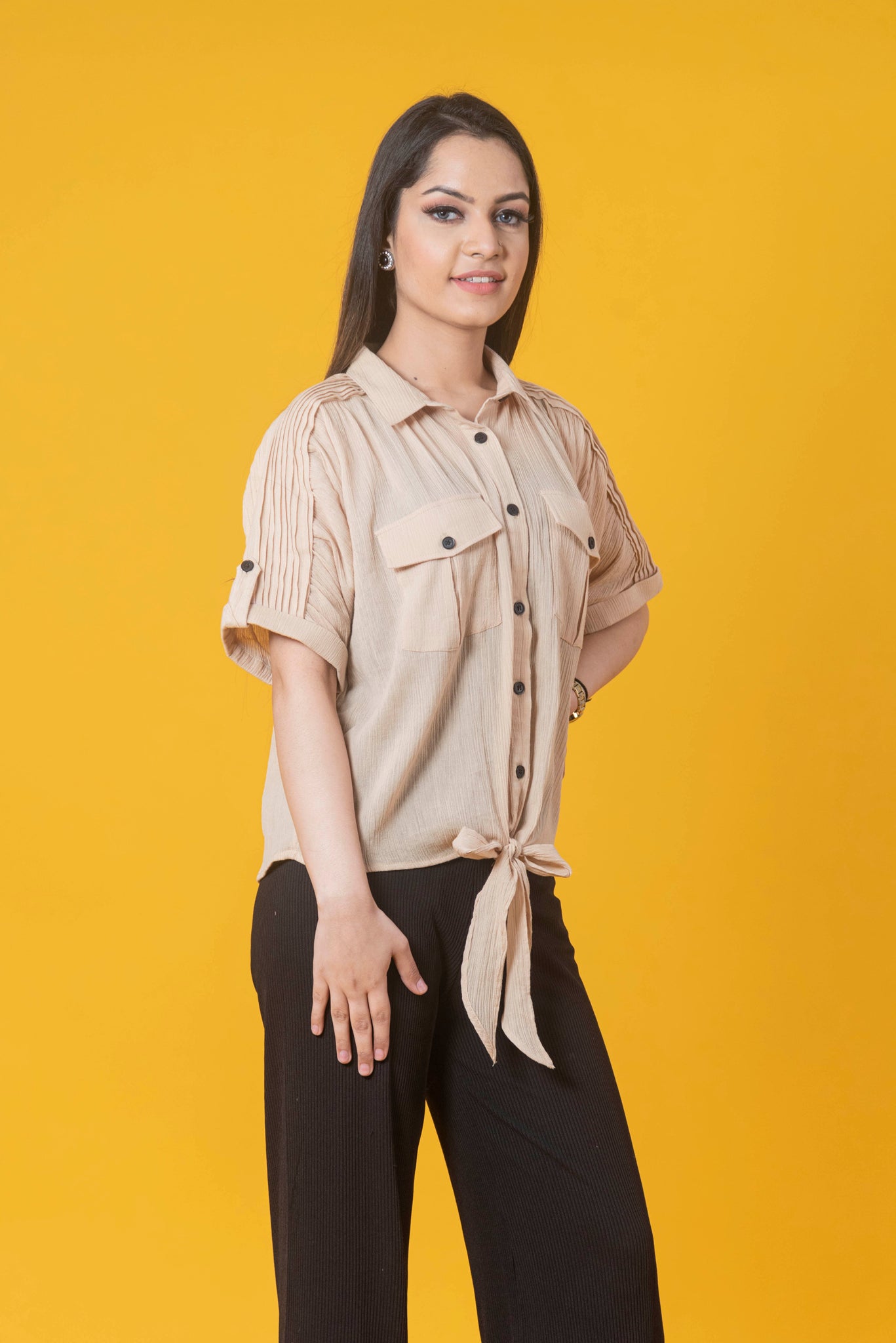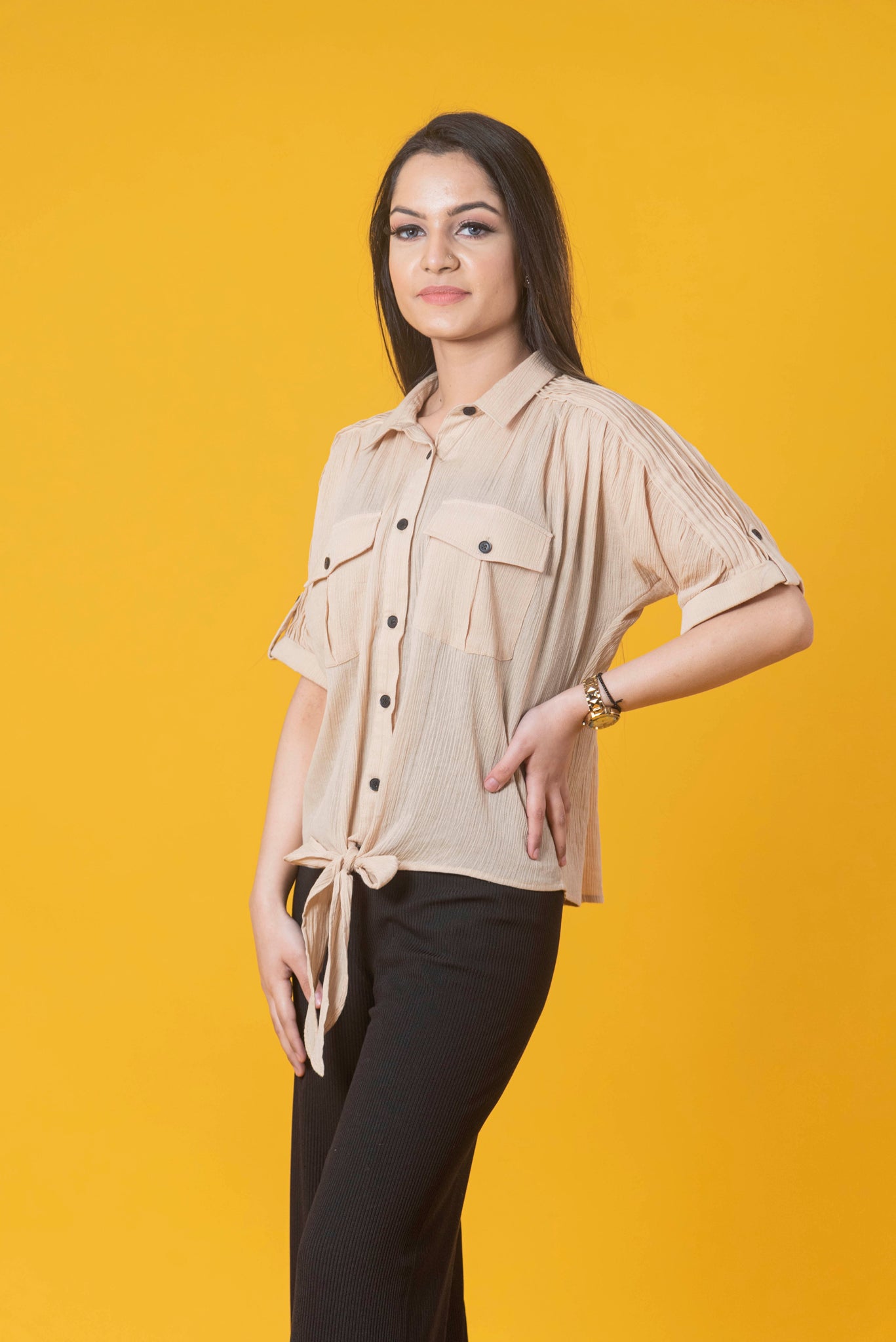 Product Detail- Beige regular shirt style top has a shirt collar, button closure and waist tie-up.