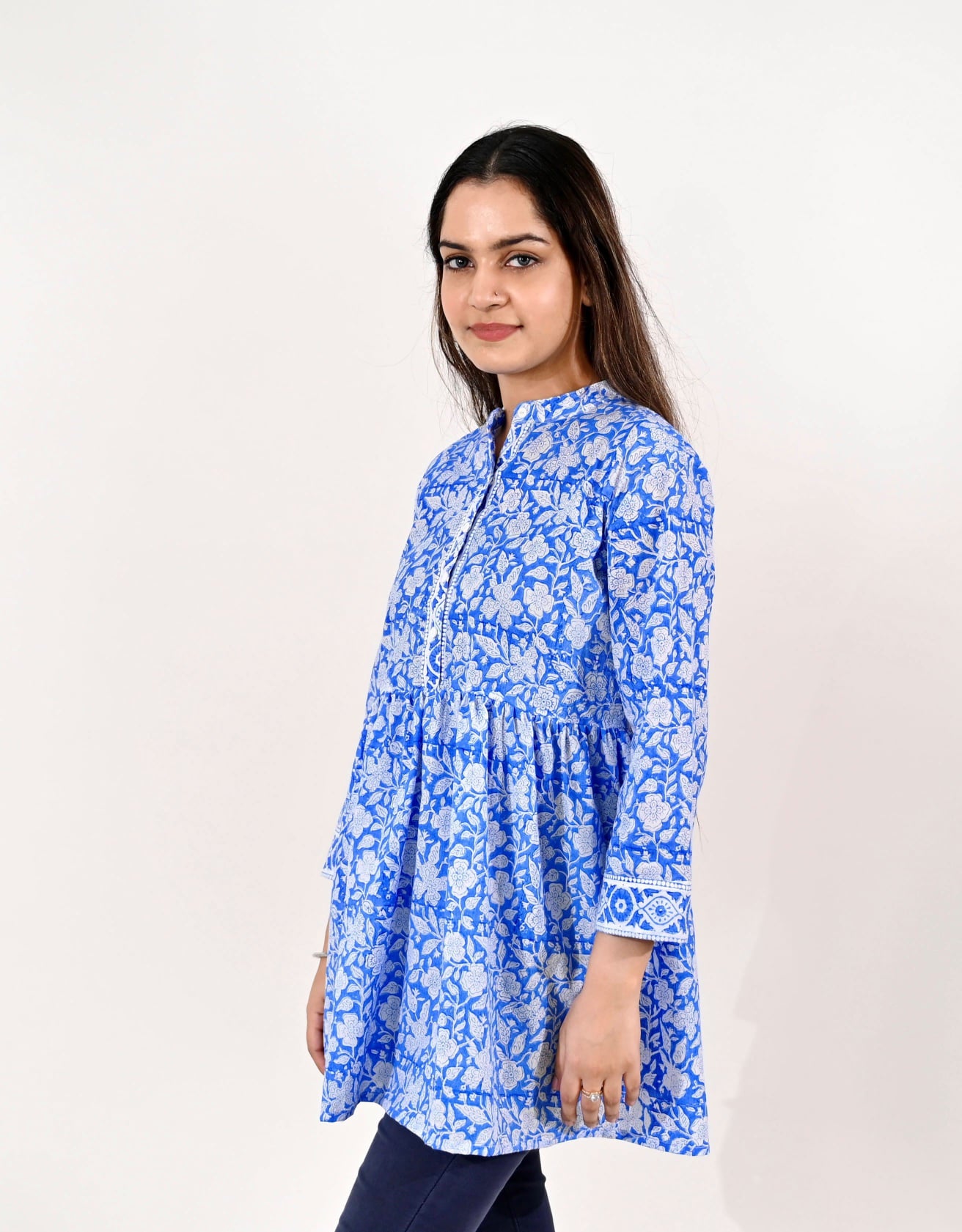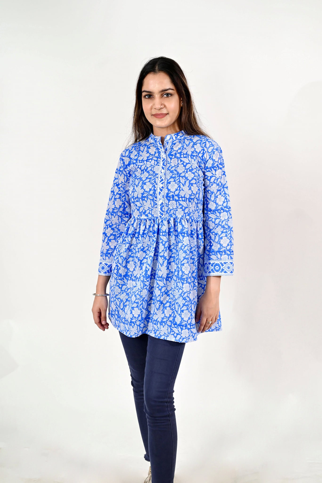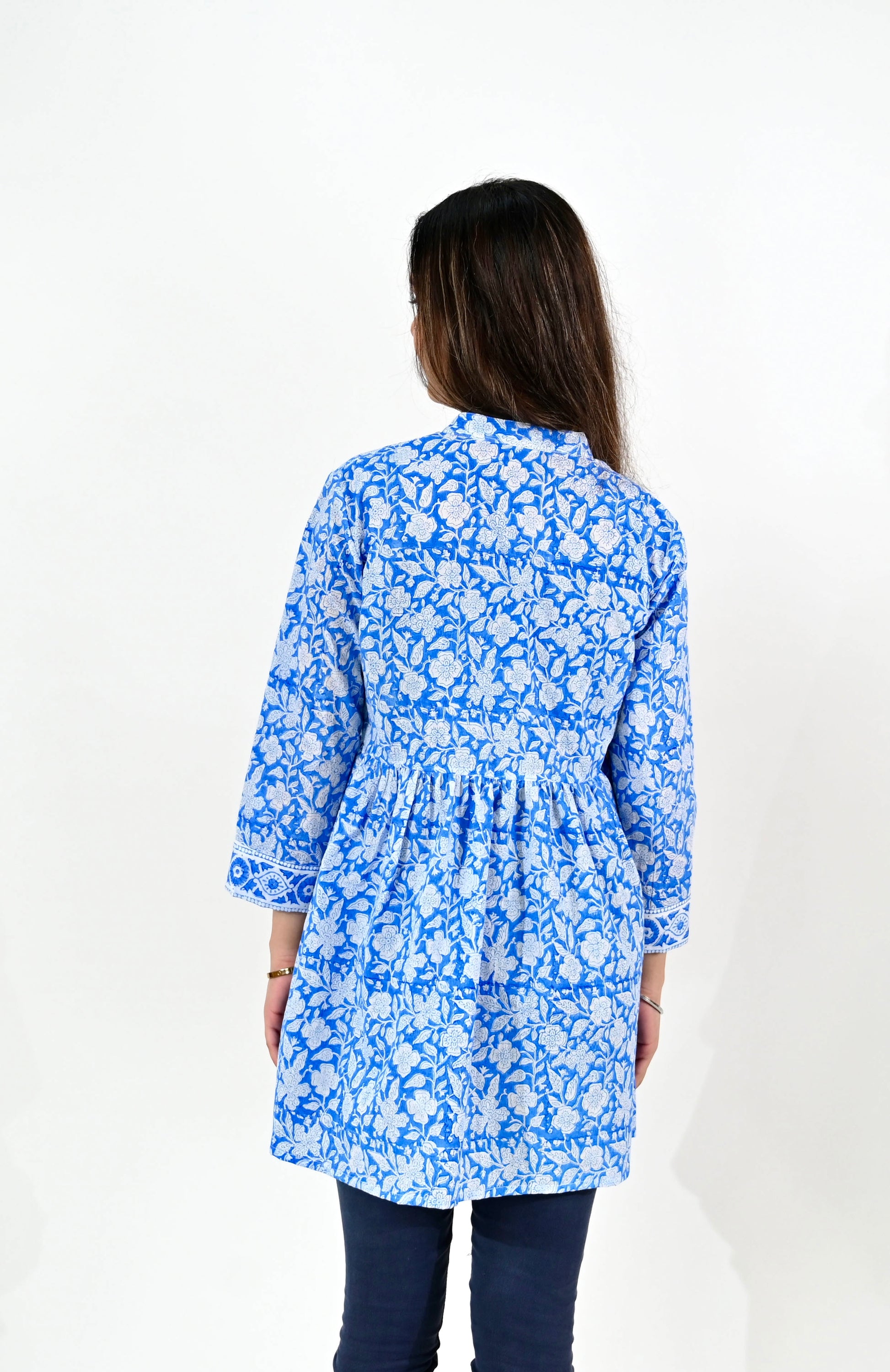 Women White & Blue Block Print Tunic